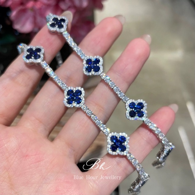 人工ロイヤルブルーサファイア 四葉のクローバー 高炭素ダイヤモンド キラキラ ゴージャス ラグジュアリー ハイカーボンダイヤモンド 人工 シルバー925 シルバー ホワイト エタニティブレスレット 高級感 レトロ 青 四つ葉 ヘイローブレスレット