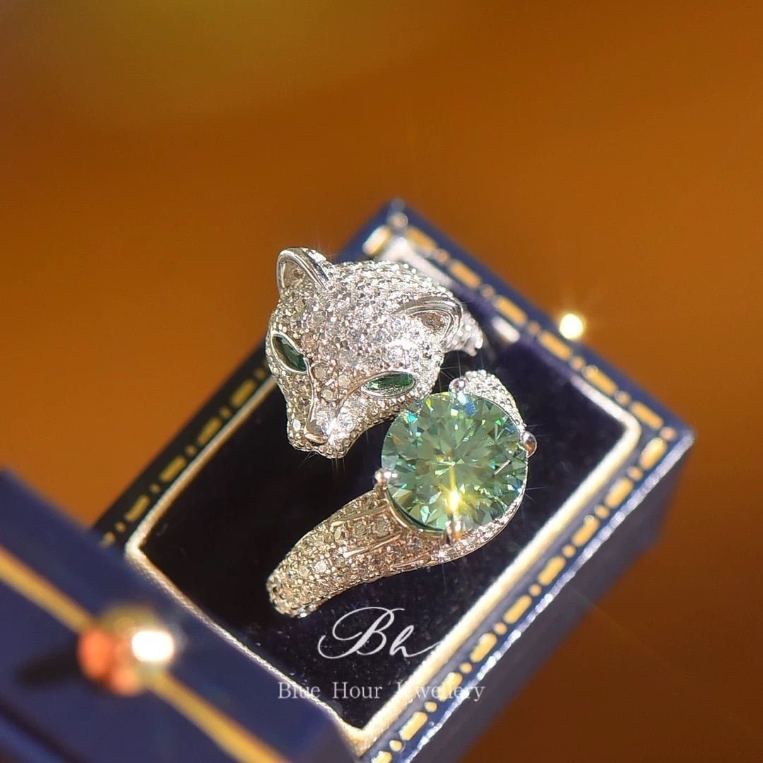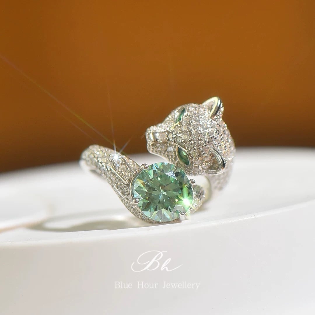 豹 ブルーグリーン ラウンド 2ct モアッサナイト キラキラ ゴージャス ラグジュアリー モアサナイト 指輪 ダイヤモンド ビッグ 大きめ ワイドリング メレタイプ ヒップホップ かっこいい クール ヒョウ 青緑 | Blue Hour Milan
