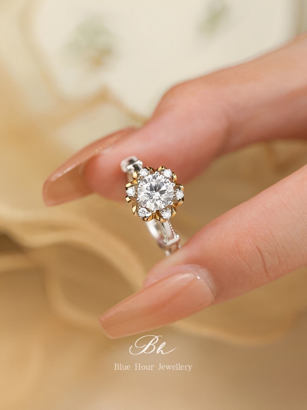 ローズ フラワー モアッサナイト キラキラ 1ct 花 ゴージャス ラグジュアリー リング シルバー925 バラ 薔薇 人工ダイヤモンド 指輪 メレタイプ ヘイローリング ラウンド ミル打ち 春 ハート イエローゴールド 薔薇 バラ | Blue Hour Milan
