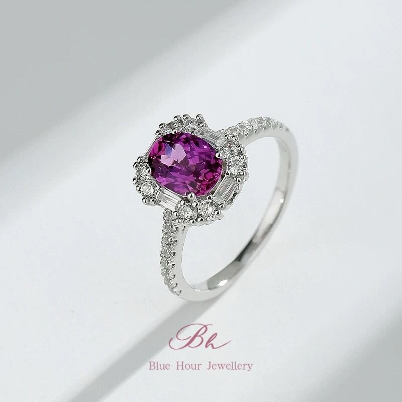 ラボグロウン 人工ピンクサファイア 2.0ct オーバル 高炭素ダイヤモンド キラキラ ゴージャス ラグジュアリー ヘイローリング 指輪 ハイカーボンダイヤモンド 人工 AG925 シルバー ホワイト レトロ 人工宝石 メレタイプ モダン | Blue Hour Milan