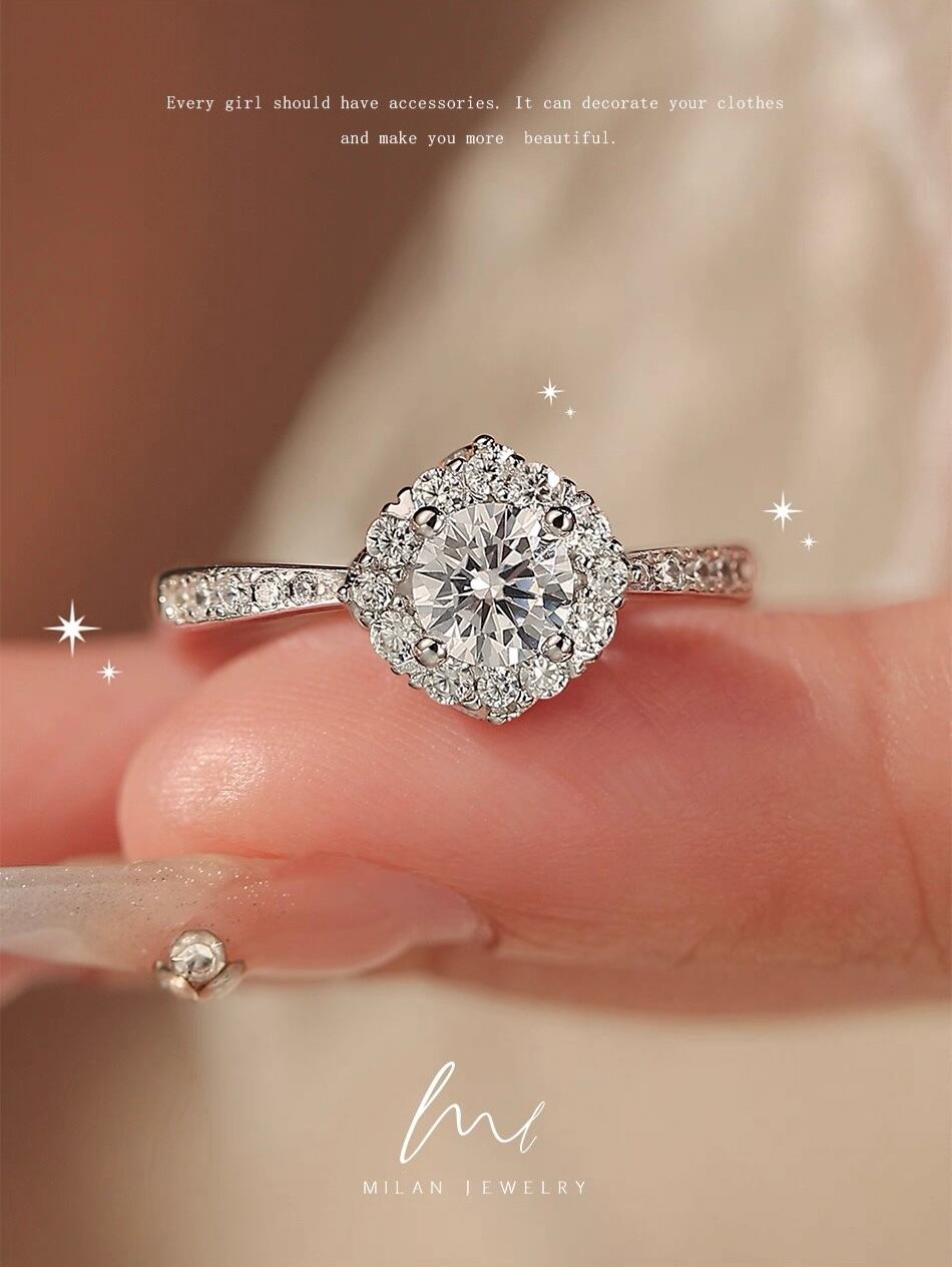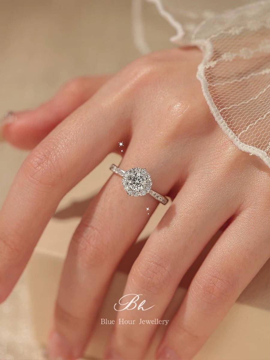 モアッサナイト 星のような キラキラ シンプル ゴージャス ラグジュアリー ヘイローリング 指輪 エンゲージリング ラウンド ダイヤモンド メレ シルバー925 モアサナイト ホワイト | Blue Hour Milan