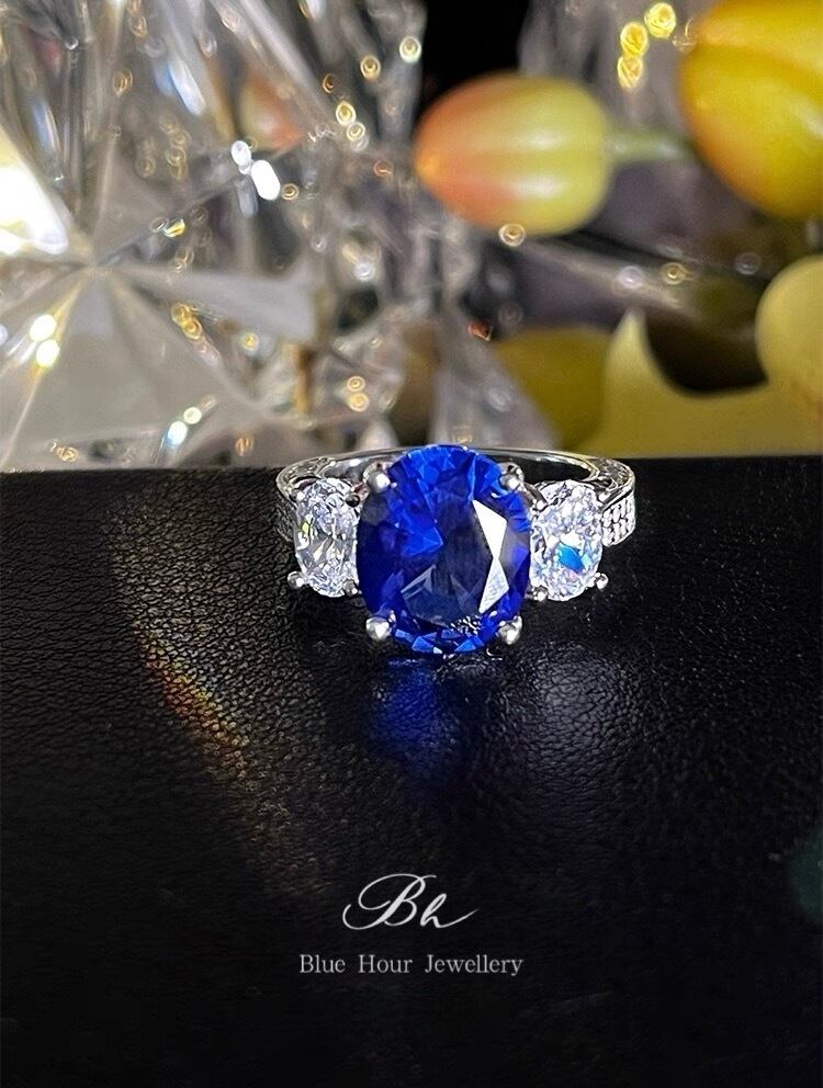 ラボ合成ロイヤルブルーサファイア オーバル ハイカーボンダイヤモンド キラキラ ゴージャス ラグジュアリー リング 指輪 シルバー925 ホワイト 高級感 グリーン レトロ メレ パヴェ 人工宝石 ブルー 大人可愛い かわいい 青色 | Blue Hour Milan