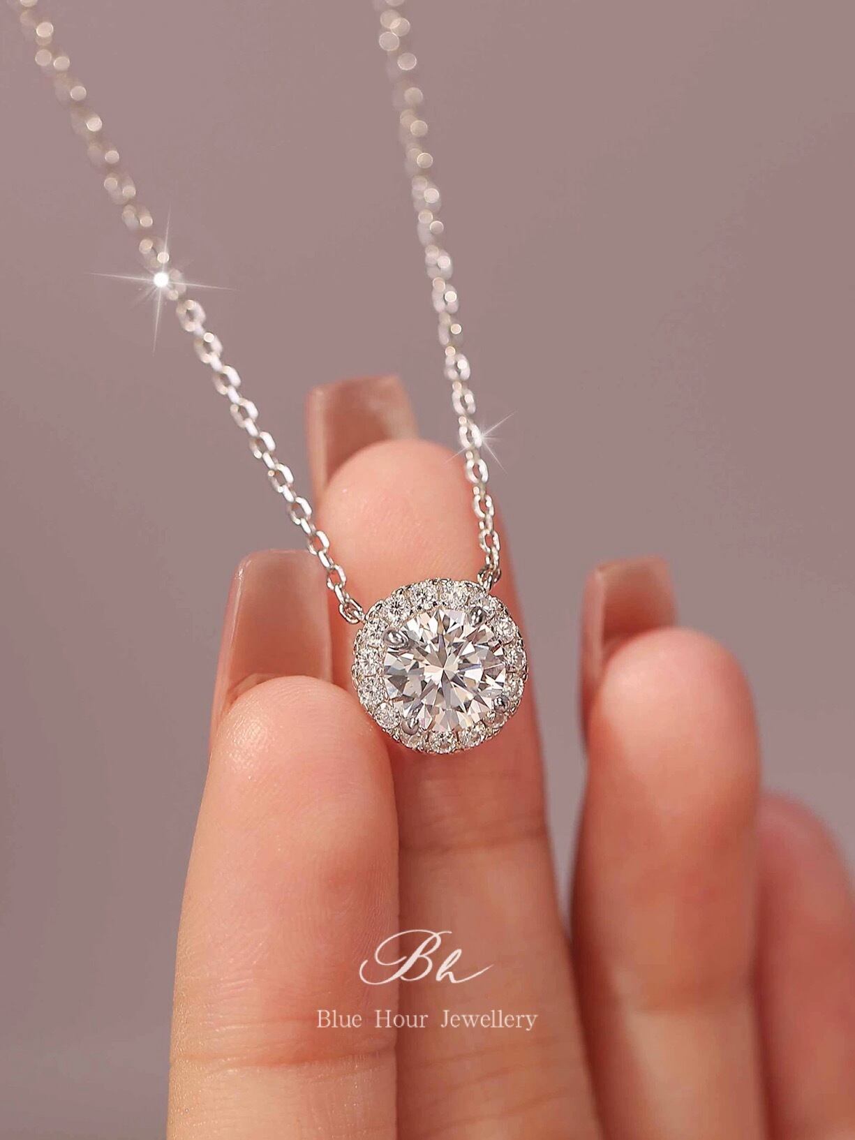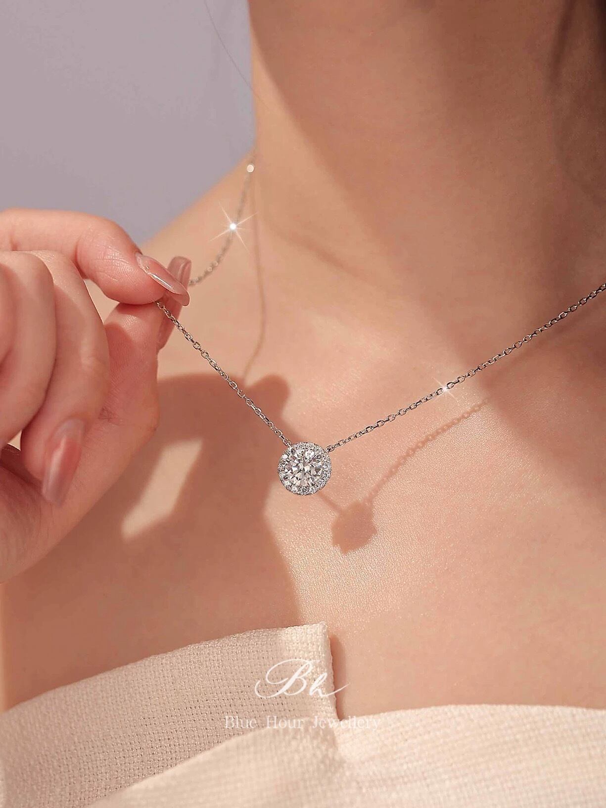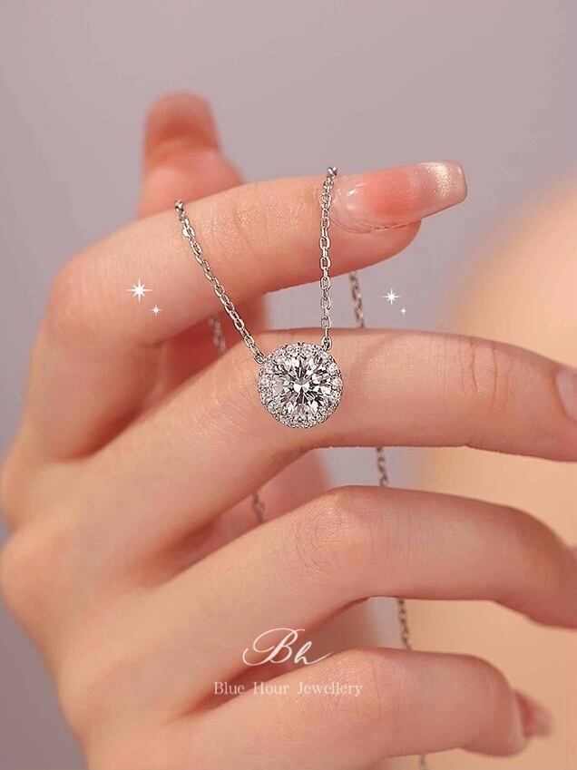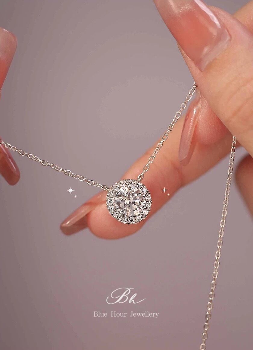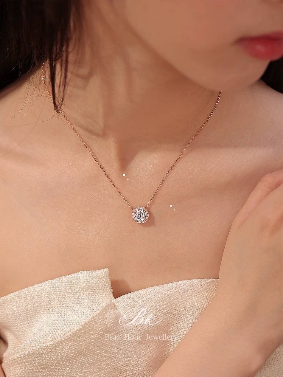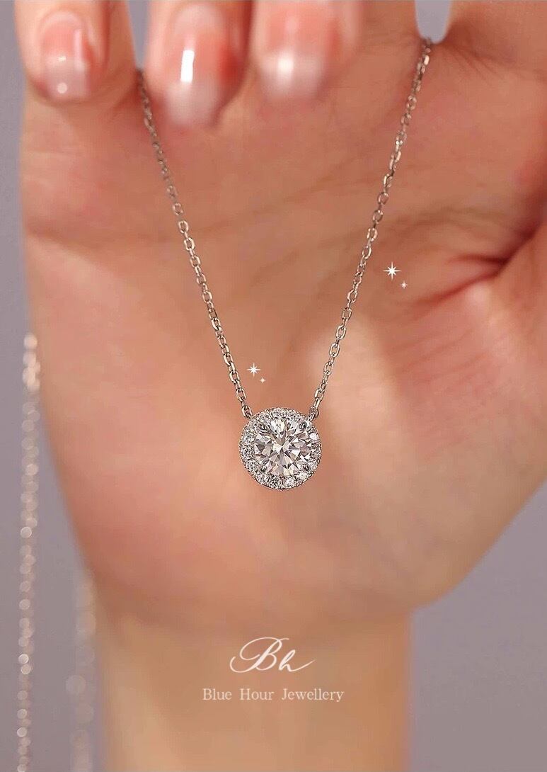 ラウンド 高炭素ダイヤモンド キラキラ ゴージャス ネックレス ハイカーボンダイヤモンド 人工 シルバー925 大人かわいい 大人可愛い シンプル 一粒 ヘイローネックレス 普段使い | Blue Hour Milan
