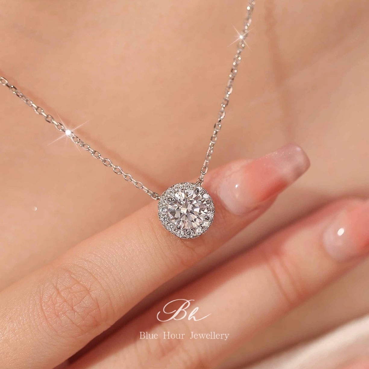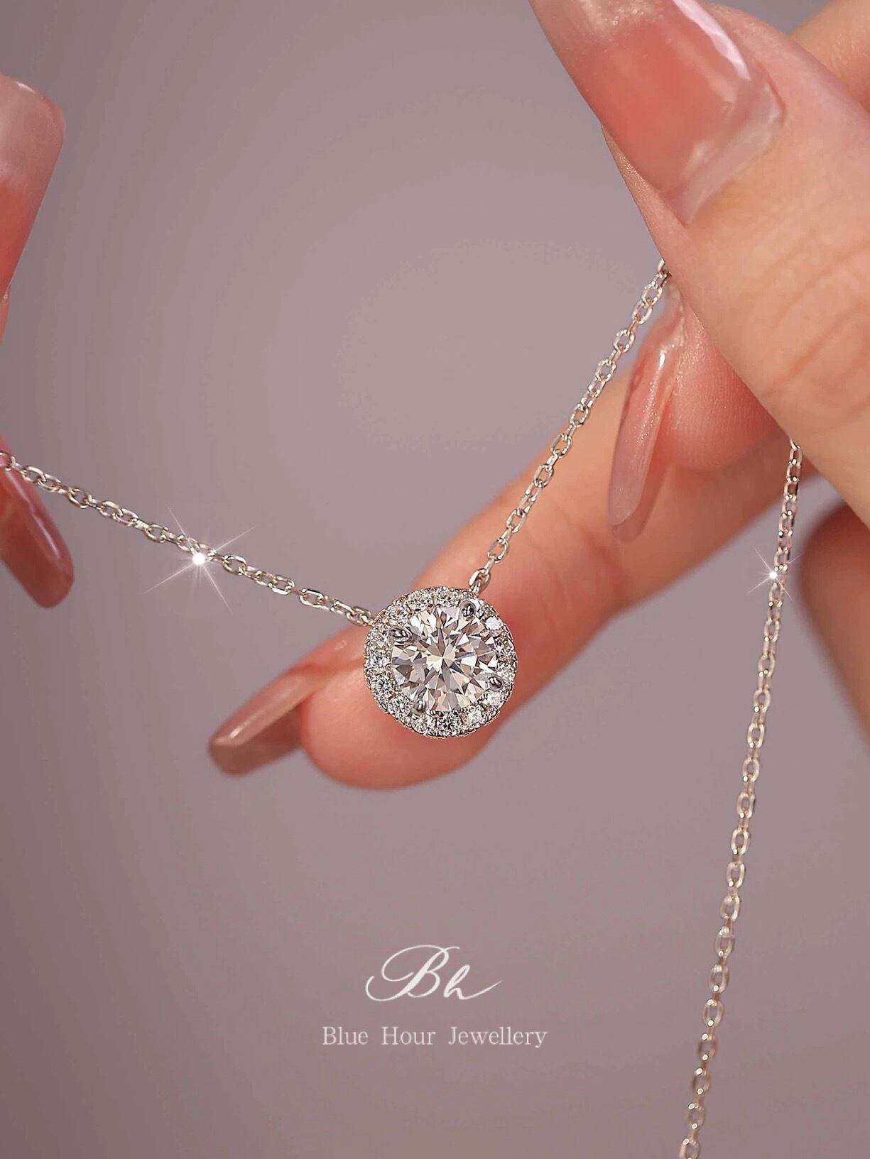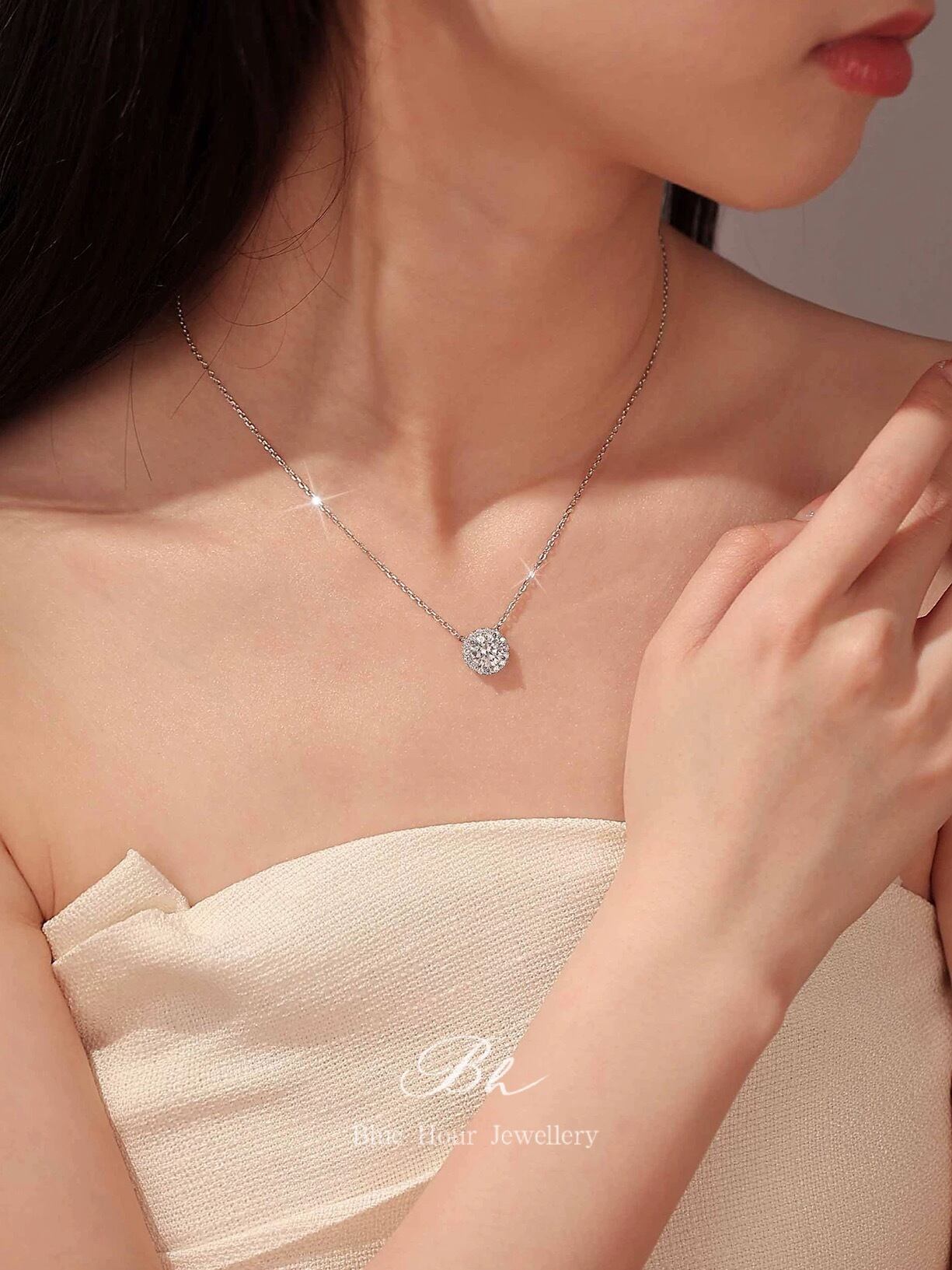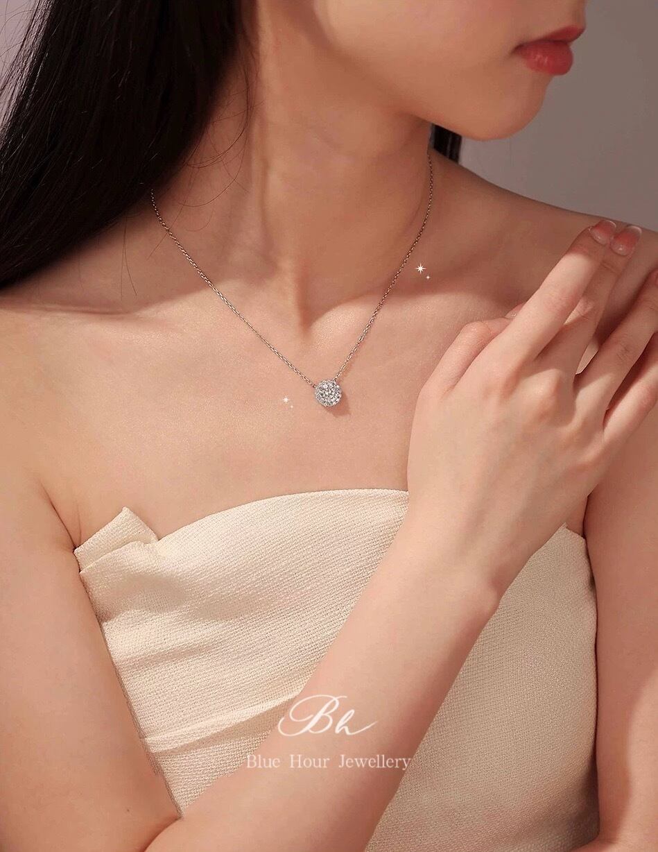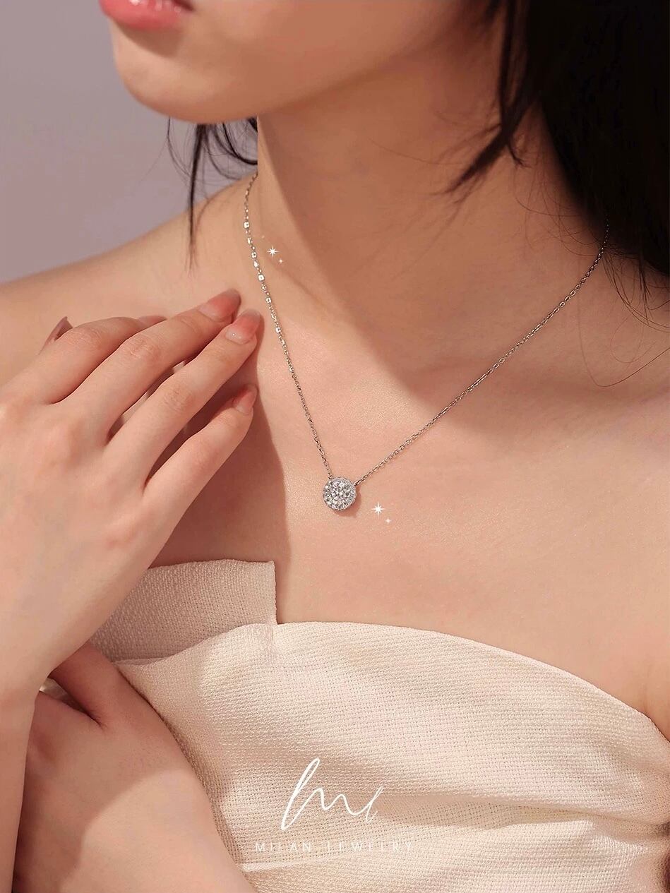 ラウンド 高炭素ダイヤモンド キラキラ ゴージャス ネックレス ハイカーボンダイヤモンド 人工 シルバー925 大人かわいい 大人可愛い シンプル 一粒 ヘイローネックレス 普段使い | Blue Hour Milan