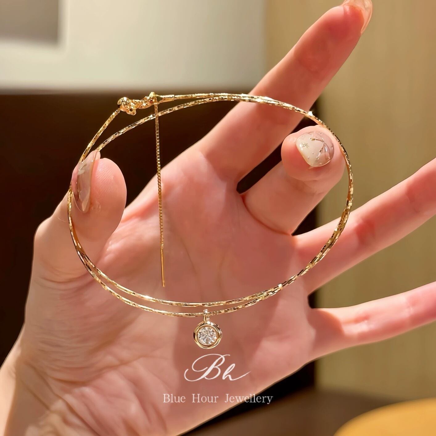 光を受けて揺れるたび、胸元に優しいきらめきを添えます。