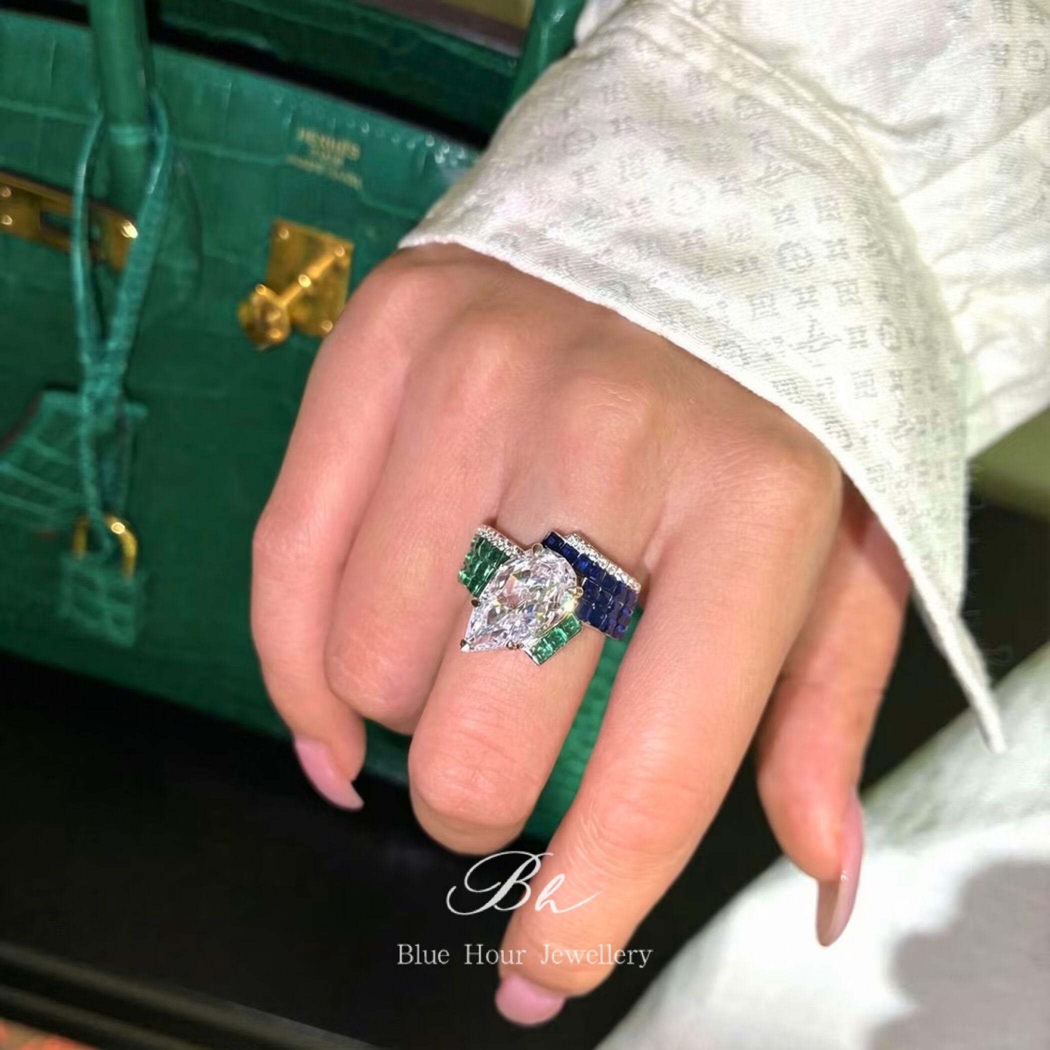 エメラルドグリーンとサファイアブルーの彩石を贅沢に配置。