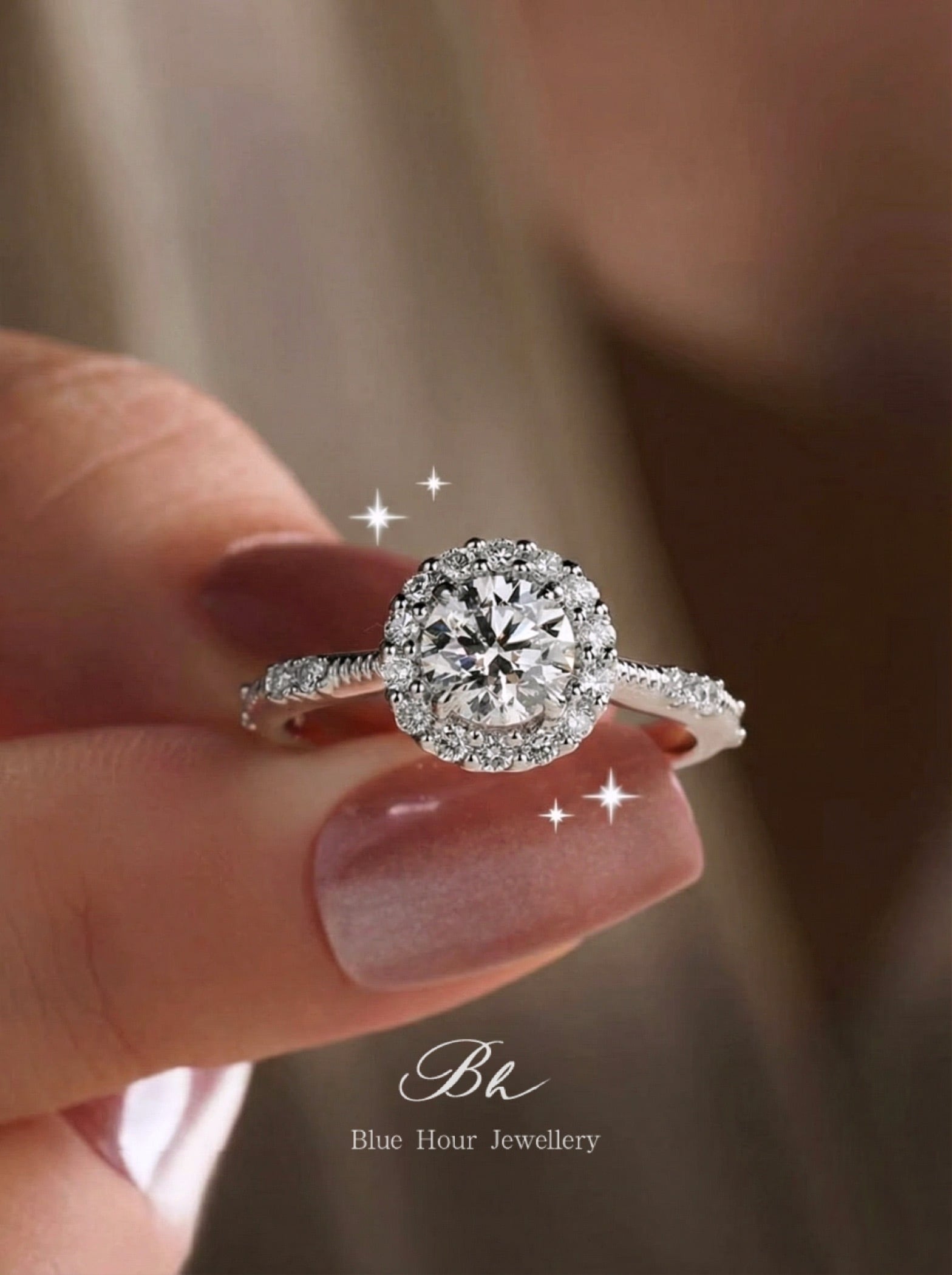 ラウンド 1ct 高炭素ダイヤモンド/モアサナイト キラキラ ゴージャス リング 指輪 ハイカーボンダイヤモンド 人工 シルバー925 ホワイト 高級感 モアッサナイト シンプル ヘイローリング