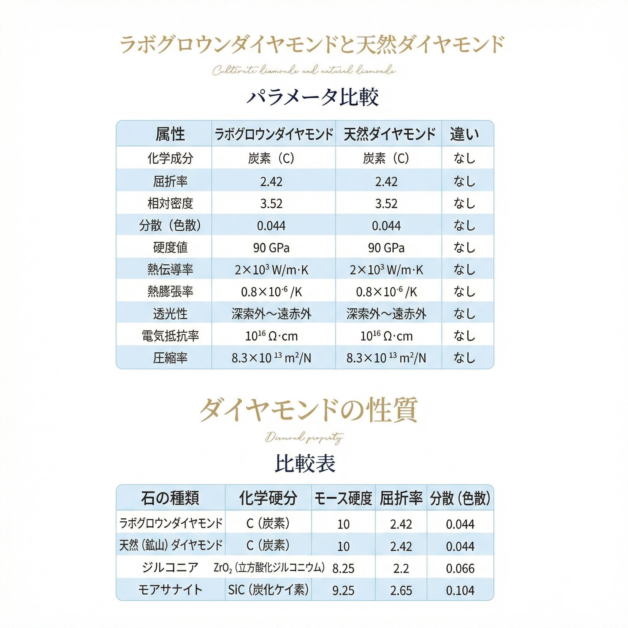 物理的性質・化学成分・輝き(光学特性)は天然ダイヤモンドと同一で、見た目や耐久性にも違いはありません。