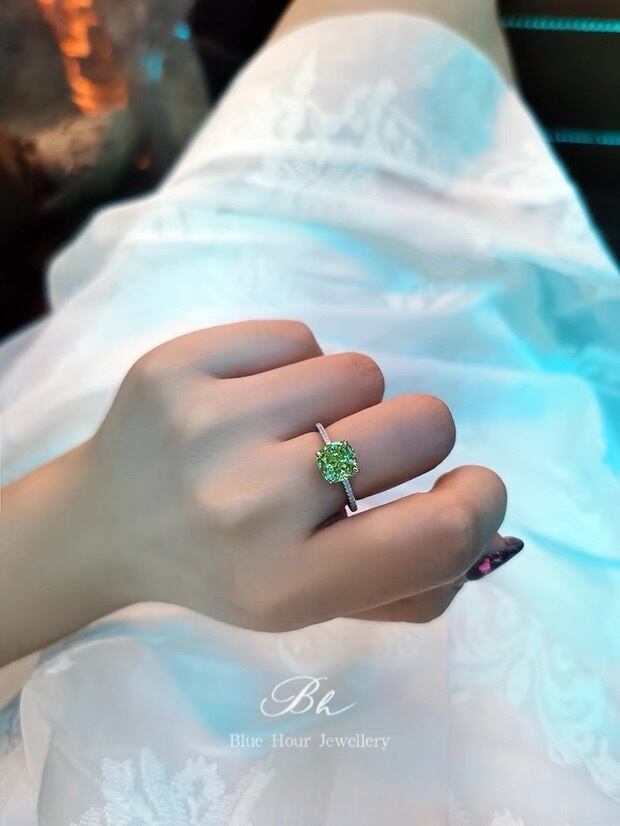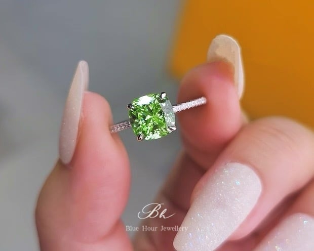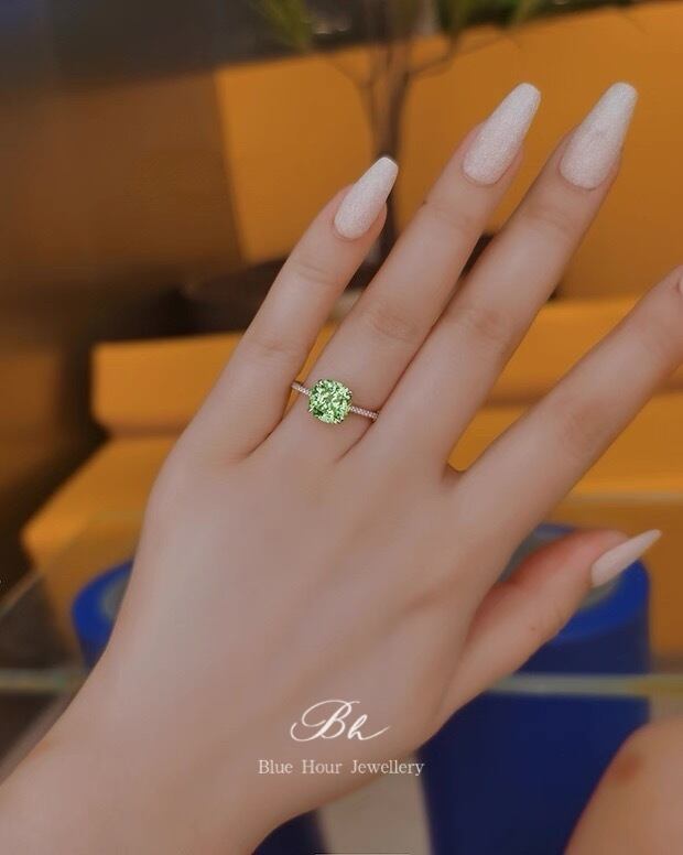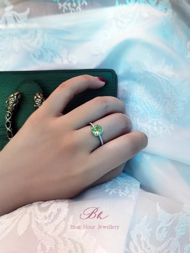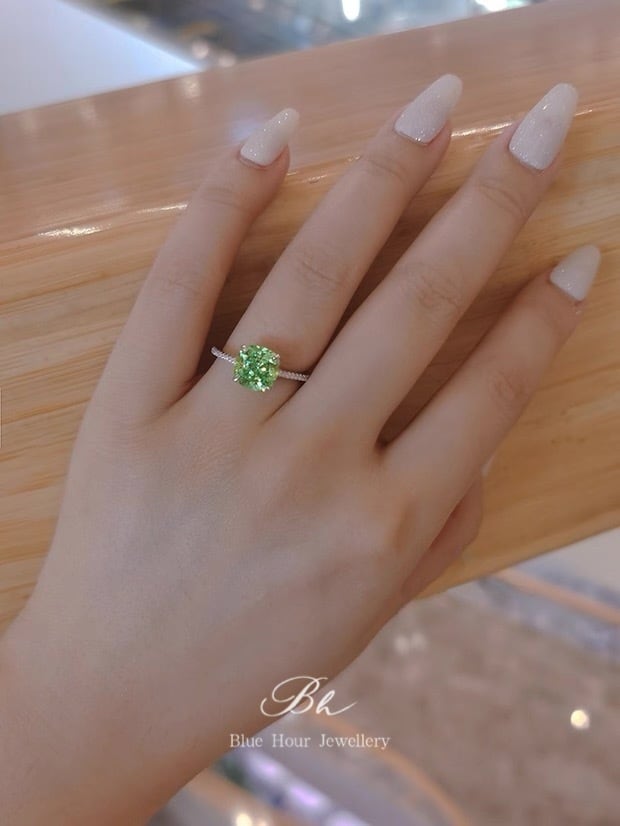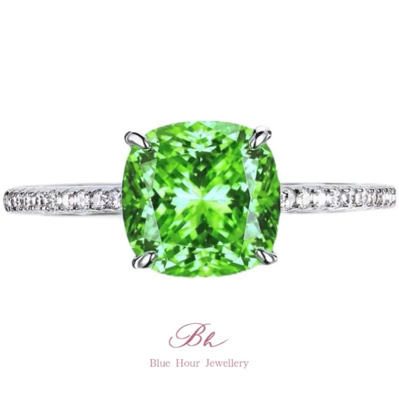 オリーブグリーン クッションカット 2ct キラキラ ゴージャス ハイカーボンダイヤモンド リング 指輪 人工 シルバー925 シルバー ホワイト グリーン 緑 人工宝石 メレタイプ