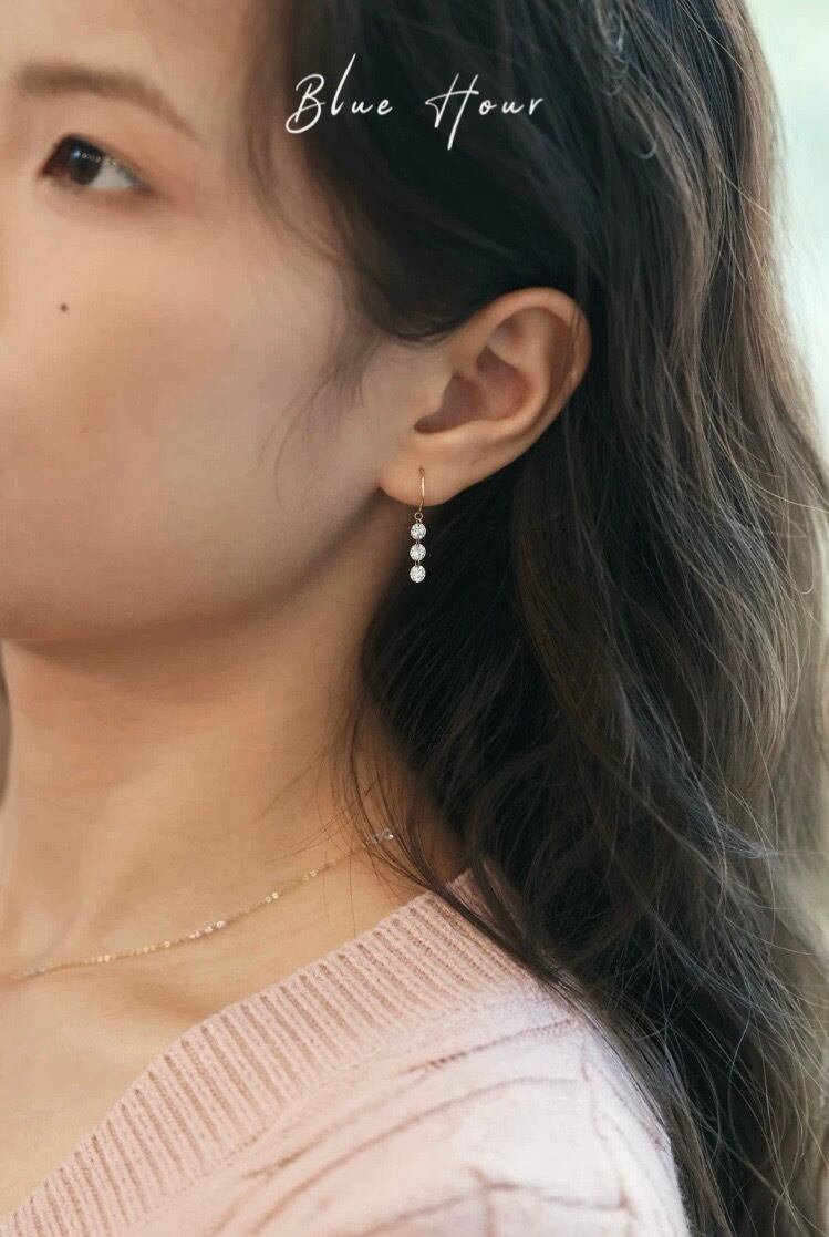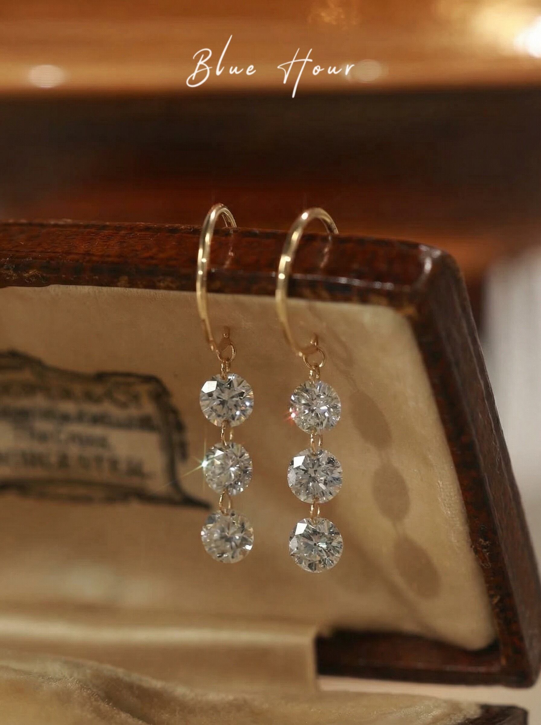 ラボグロウンダイヤモンド クラシックスリーストーン フックピアス18金 ゴージャス K18 ラウンド イエローゴールド ラウンド ドロップピアス