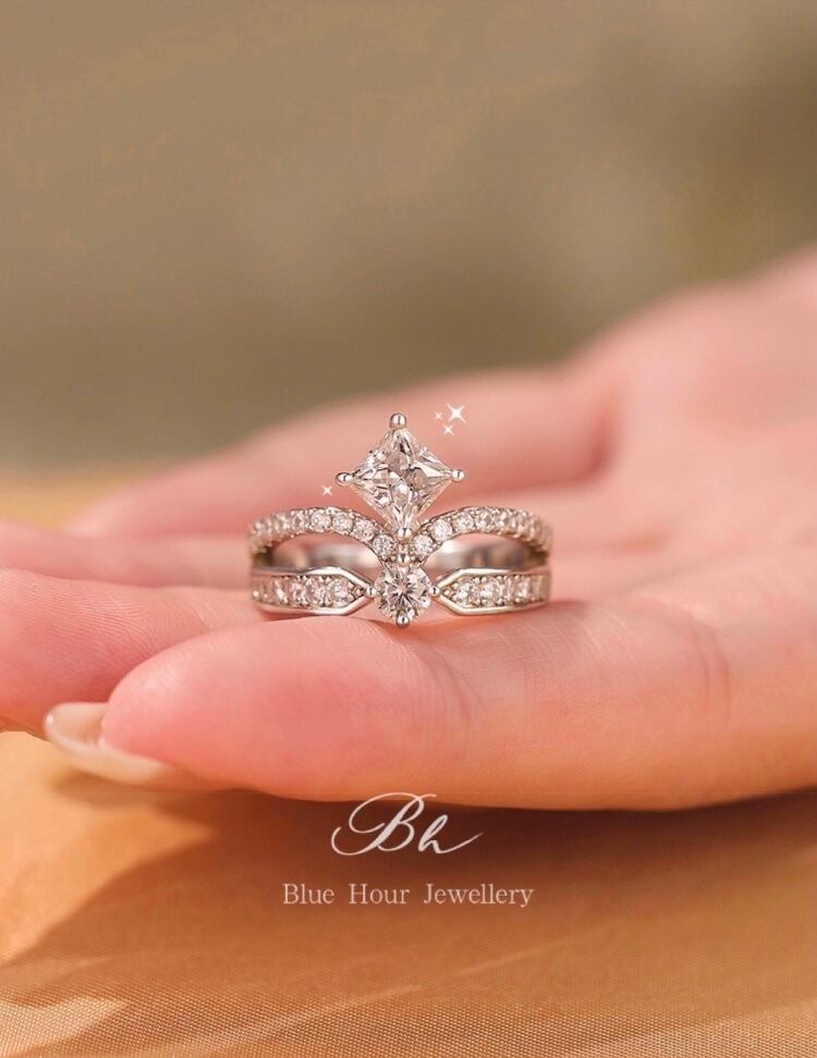 主張しすぎないプリンセス風に仕上げた「リトルクラウン」モアッサナイトリング。