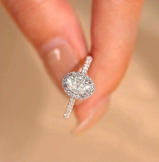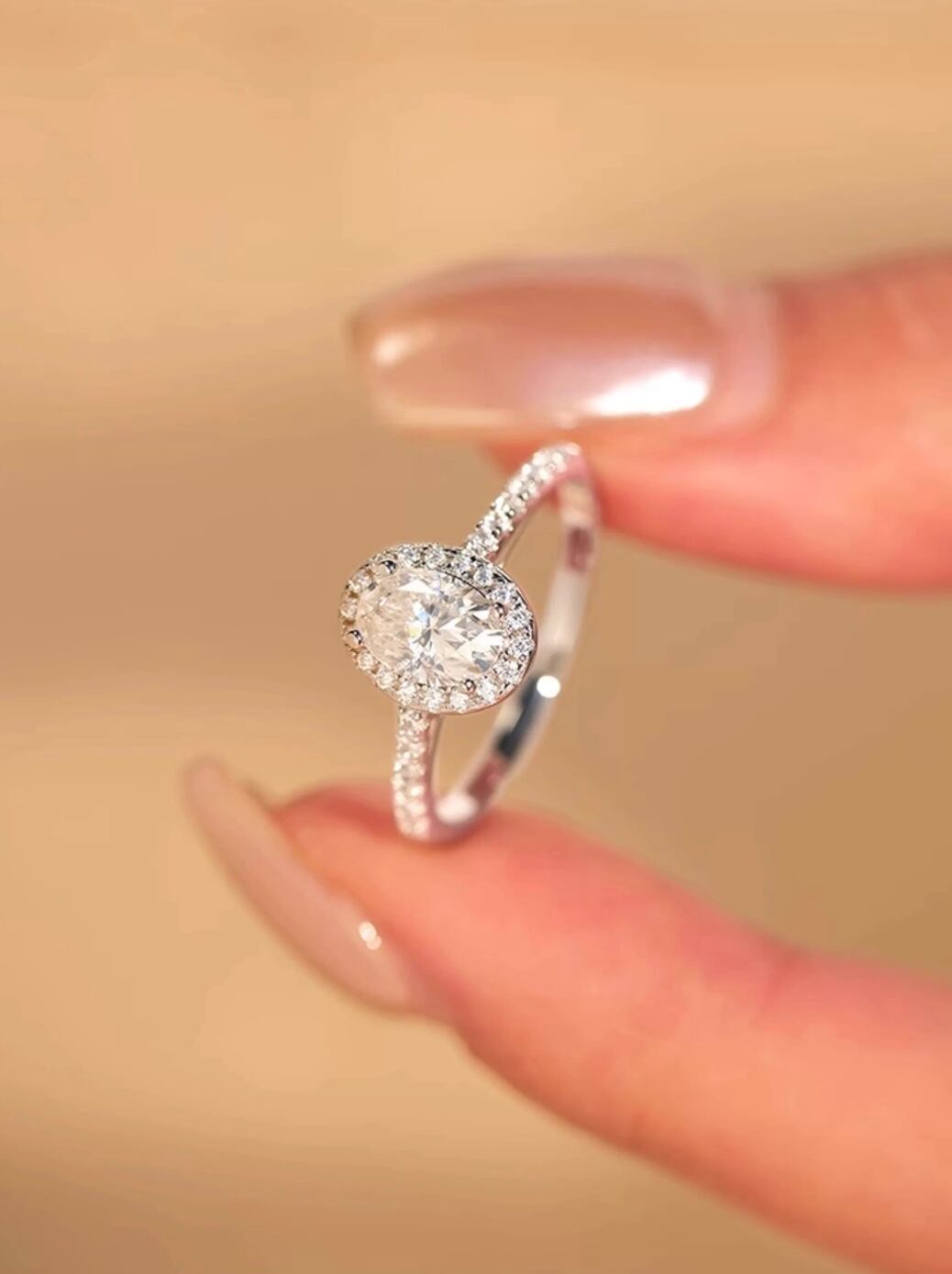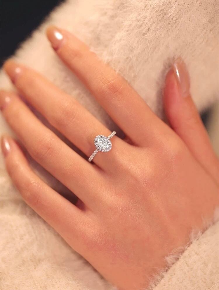 レトロでクラシック、繊細なメレストーンに囲まれた 1 カラットのオーバルセンターストーン。星のように指先に纏う。