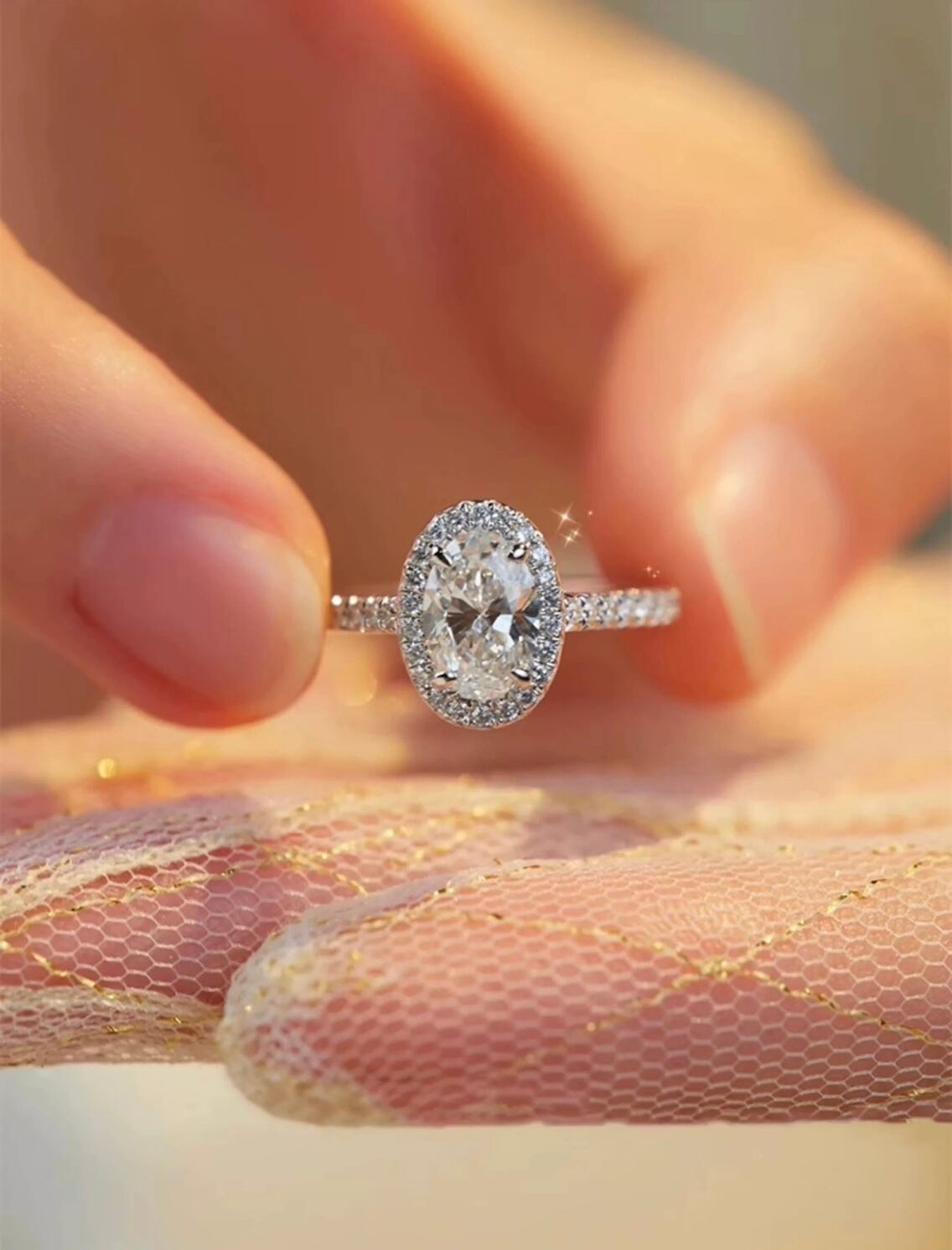レトロでクラシック、繊細なメレストーンに囲まれた 1 カラットのオーバルセンターストーン。星のように指先に纏う。