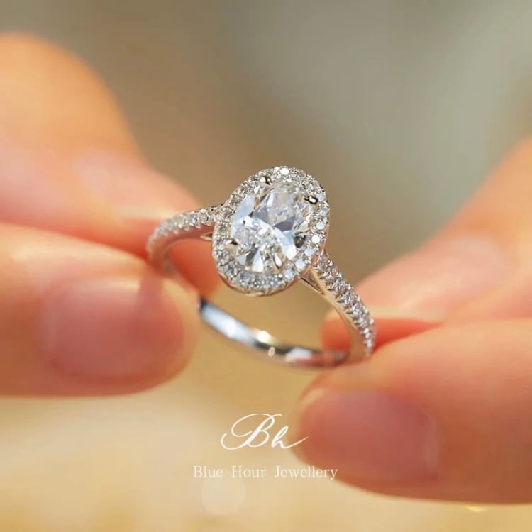 オリジナルのモアッサナイトのオーバルヘイローリングになります。