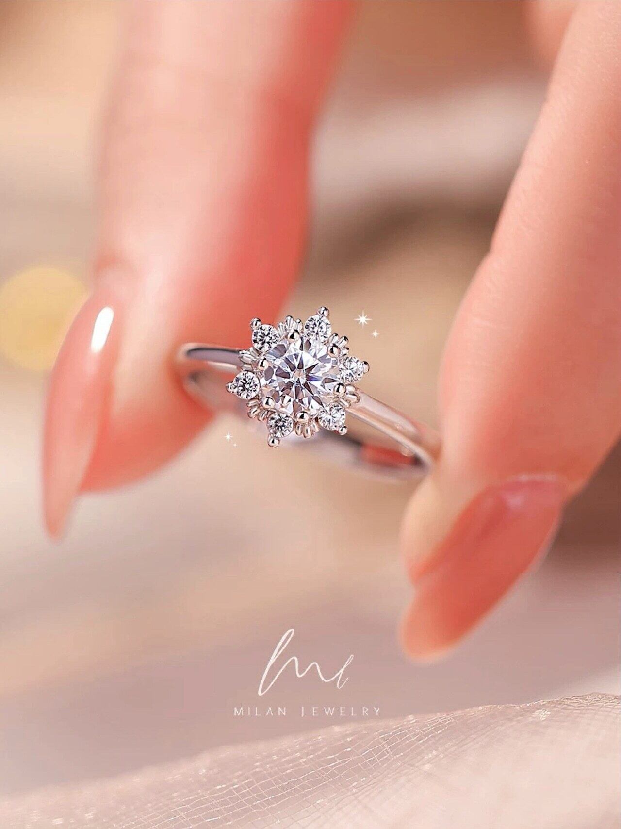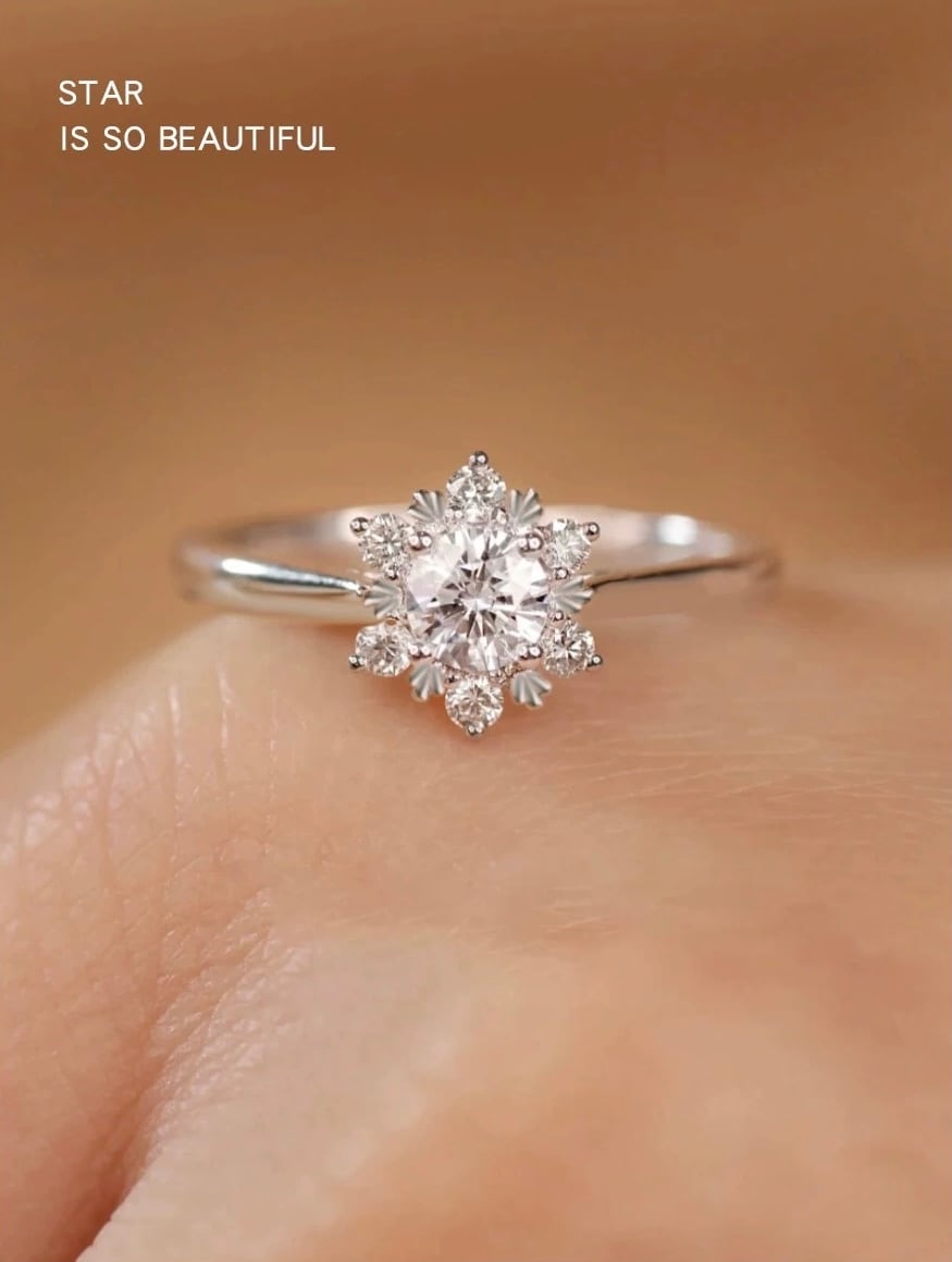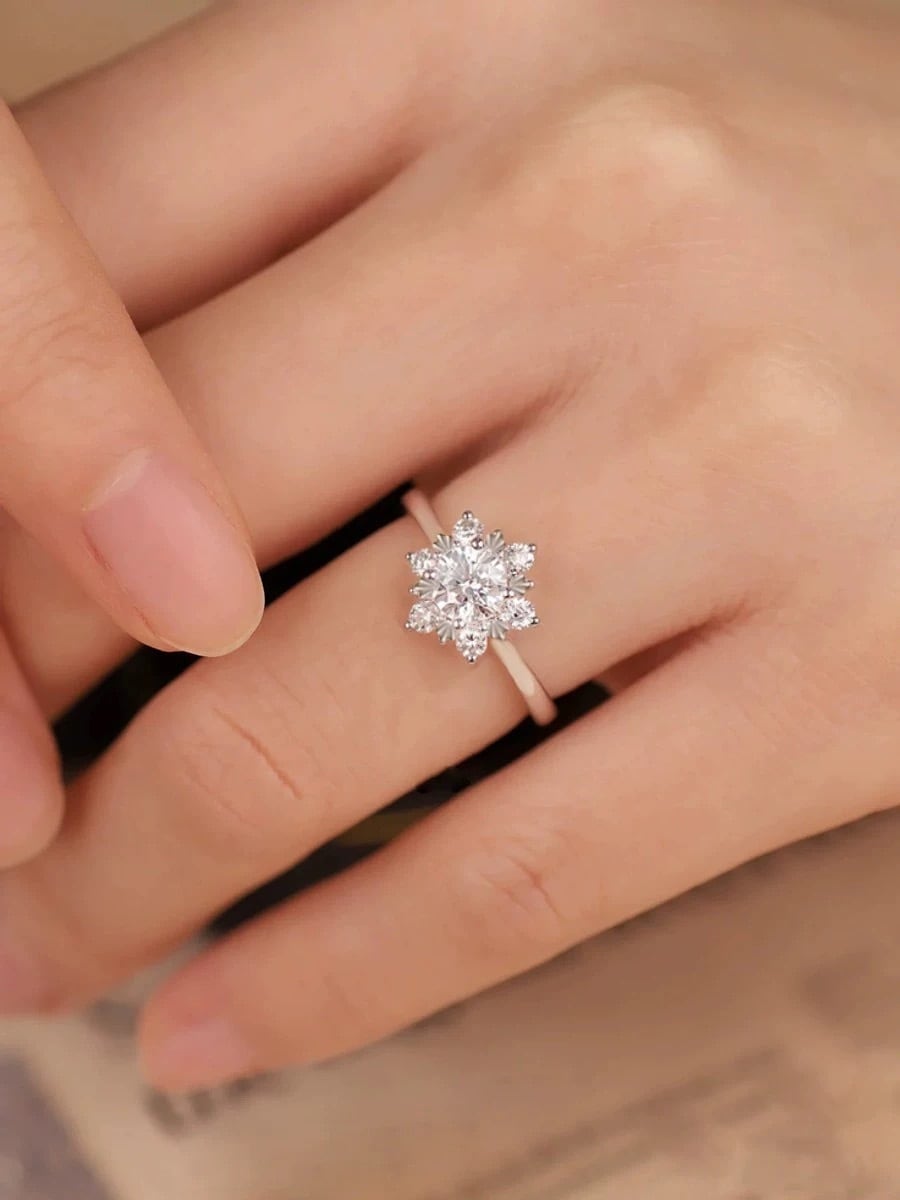 美しい雪の結晶シェイプのモアッサナイトリング。シンプルでゴージャス。