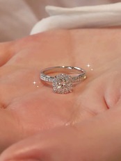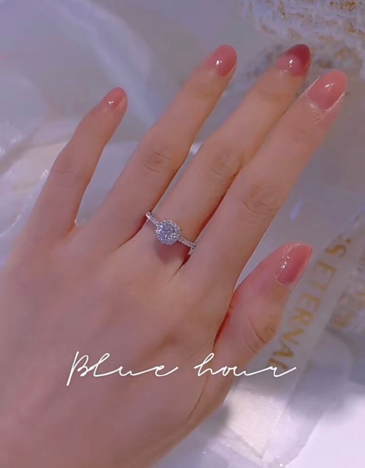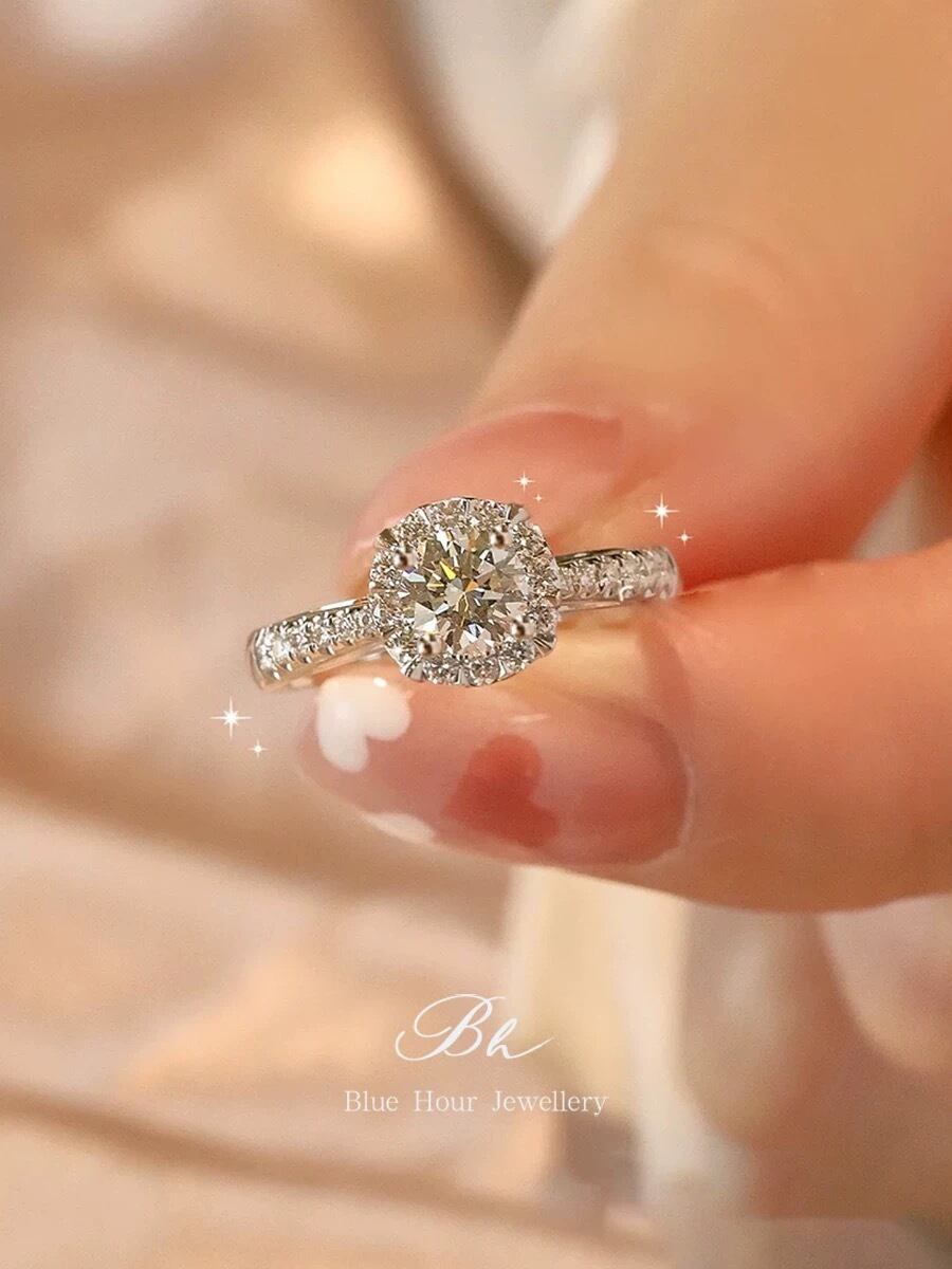 ヘイローリングデザインで0.5カラットよりも大きく見せる効果があります。