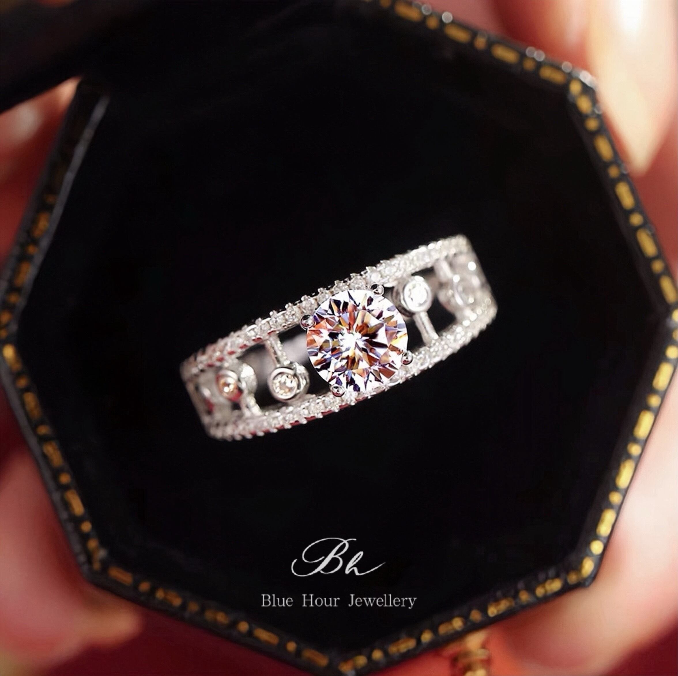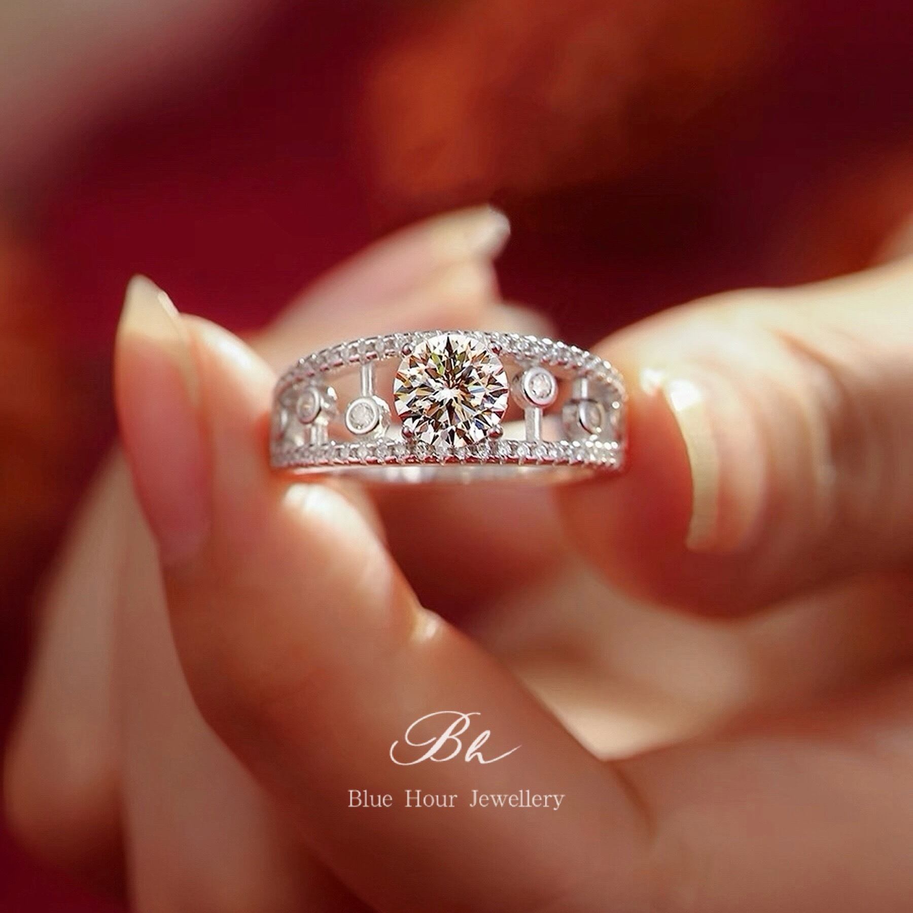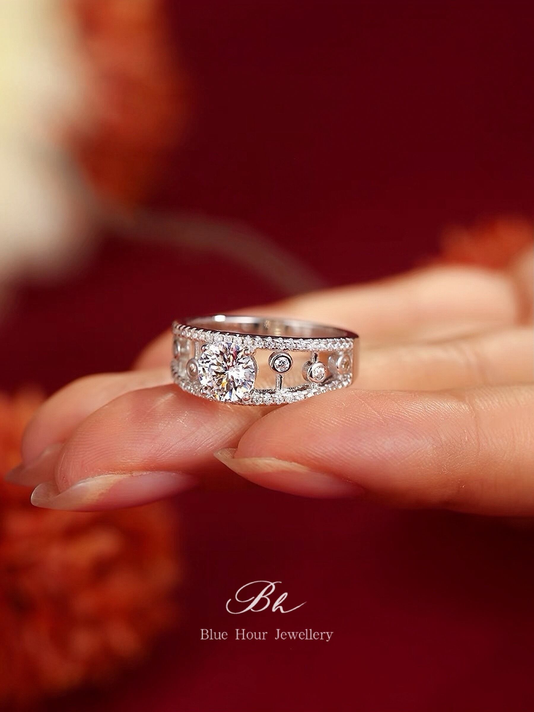 デュードロップ 中空 モアッサナイト ラウンド リング 1ct キラキラ ゴージャス ラグジュアリー ハイエンド レース モアサナイト ワイドリング 人工ダイヤモンド | Blue Hour Milan