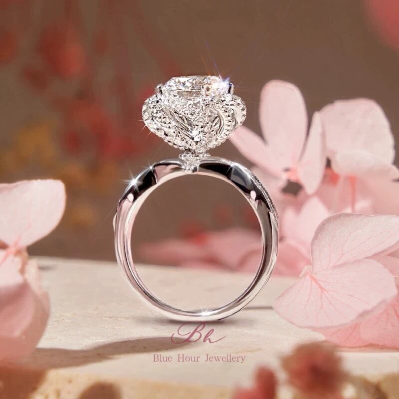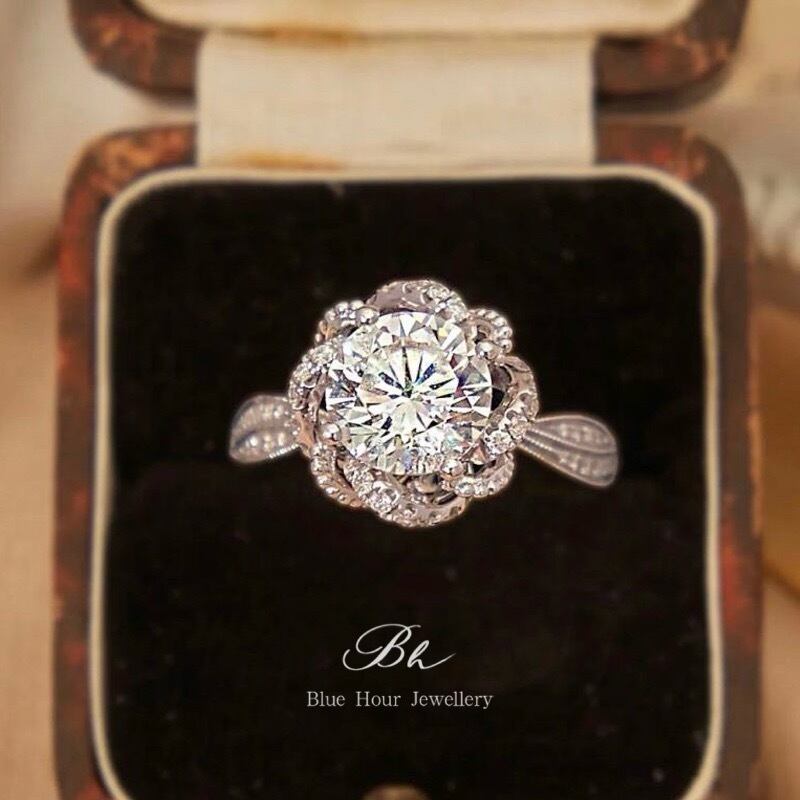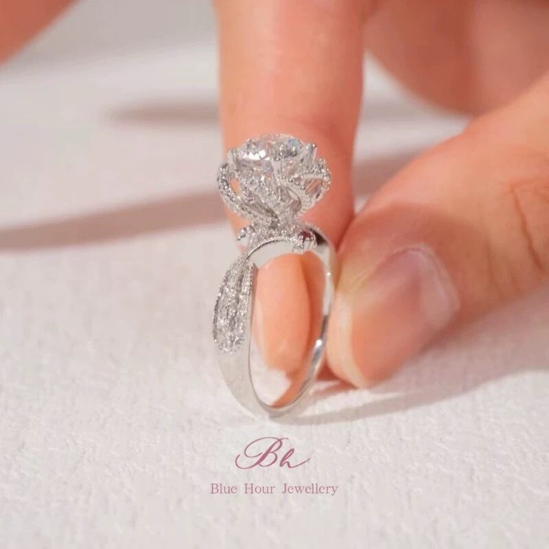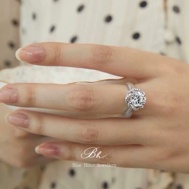 ローズ モアッサナイト 1ct/2ct キラキラ ゴージャス ラグジュアリー ヘイローリング シルバー925 指輪 花 フラワー モアサナイト 薔薇 バラ ミル打ち | Blue Hour Milan