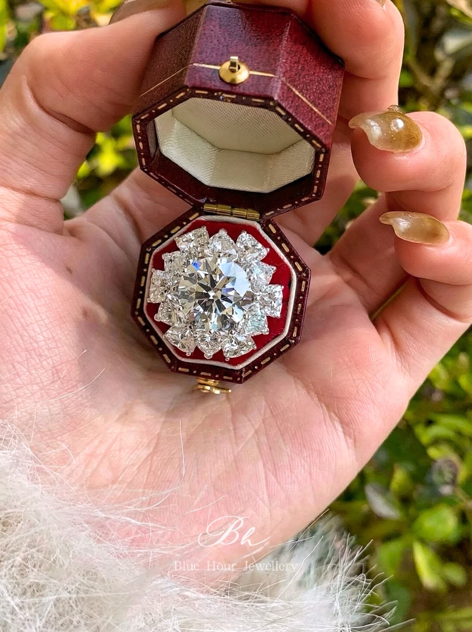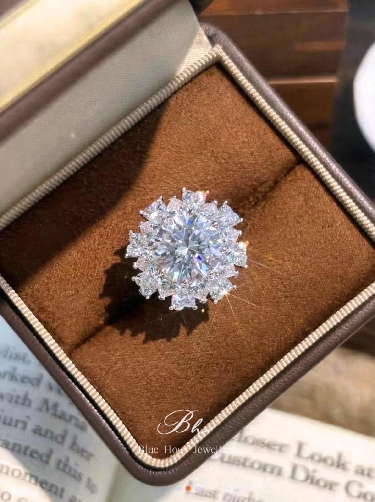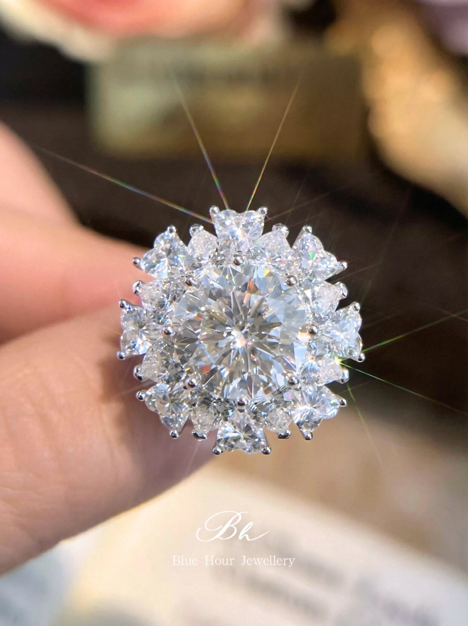 5ct フラワー モアッサナイト/ハイカーボンダイヤモンド キラキラ ゴージャス ラグジュアリー ハート ヘイローリング シルバー925 指輪 花 モアサナイト 大きめ ダイヤモンド ラウンド