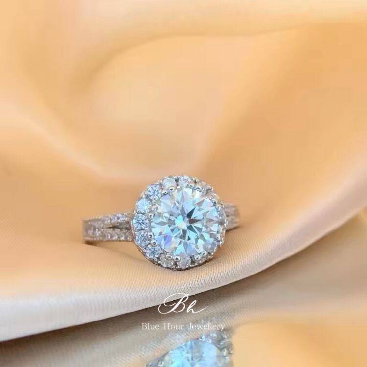 2カラット モアッサナイト キラキラ ゴージャス ラグジュアリー ヘイローリング シルバー925 指輪 モアサナイト ラウンド 人工ダイヤモンド メレ エンゲージリング | Blue Hour Milan