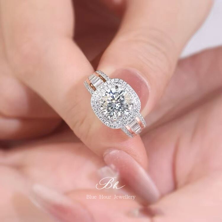 ラウンド 2ct モアッサナイト ダブルヘイローリング キラキラ ゴージャス ラグジュアリー モアサナイト 指輪 ダイヤモンド エンゲージリング ローズゴールド ビッグ 大きめ ワイドリング | Blue Hour Milan